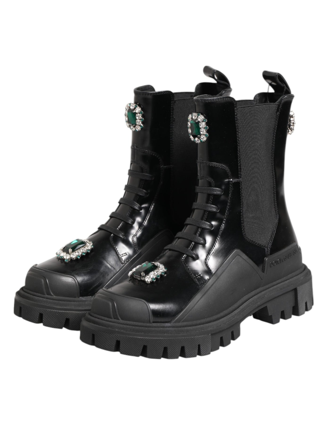 Gorgeous brand new, 100% Authentic Dolce & Gabbana shoes feature a bold black combat boot design crafted from premium leather, highlighted by striking crystal embellishments on the toe. These ankle boots combine edgy style with luxurious detailing, offering a standout look perfect for high-fashion streetwear or statement outfits.