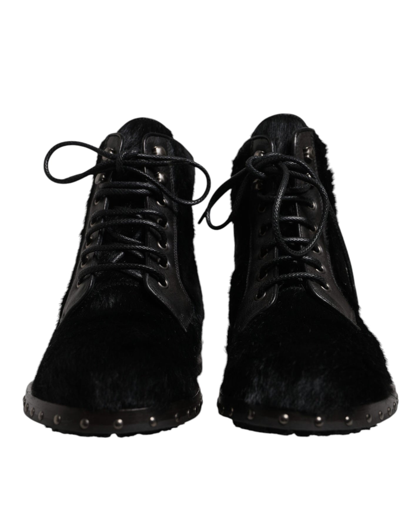 Absolutely stunning, 100% Authentic, brand new with tags Dolce & Gabbana lace up boots featuring upper made of black pony skin leather and sole in super light natural rubber.