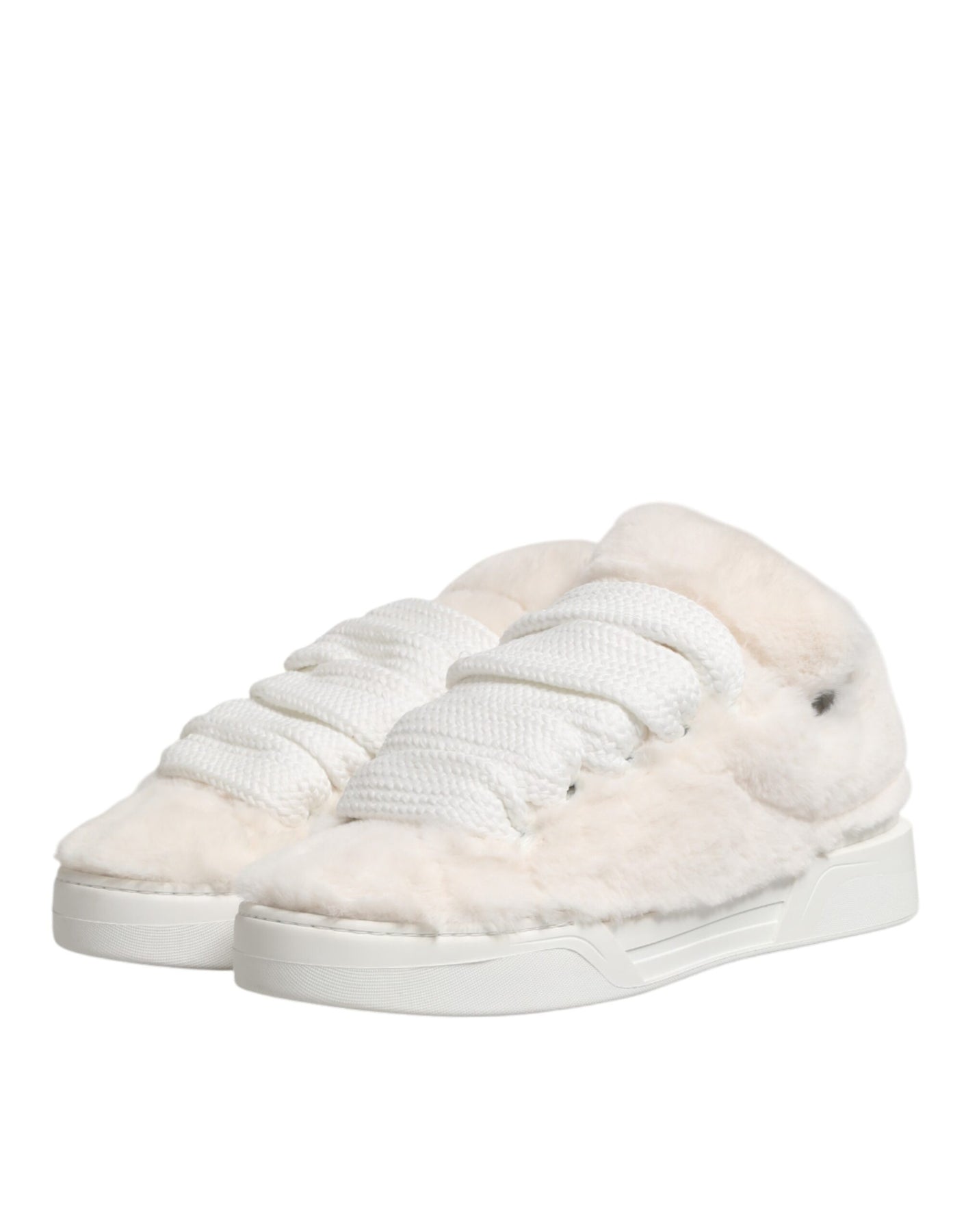 Gorgeous brand new, 100% Authentic Dolce & Gabbana low-top sneakers. Crafted in Italy, these luxury sneakers feature a plush white shearling (eco-fur) upper with a cozy, textured finish and oversized tonal laces. The minimalist silhouette is elevated by a clean rubber sole and refined detailing, offering a bold yet elegant statement piece perfect for high-end casual wear.